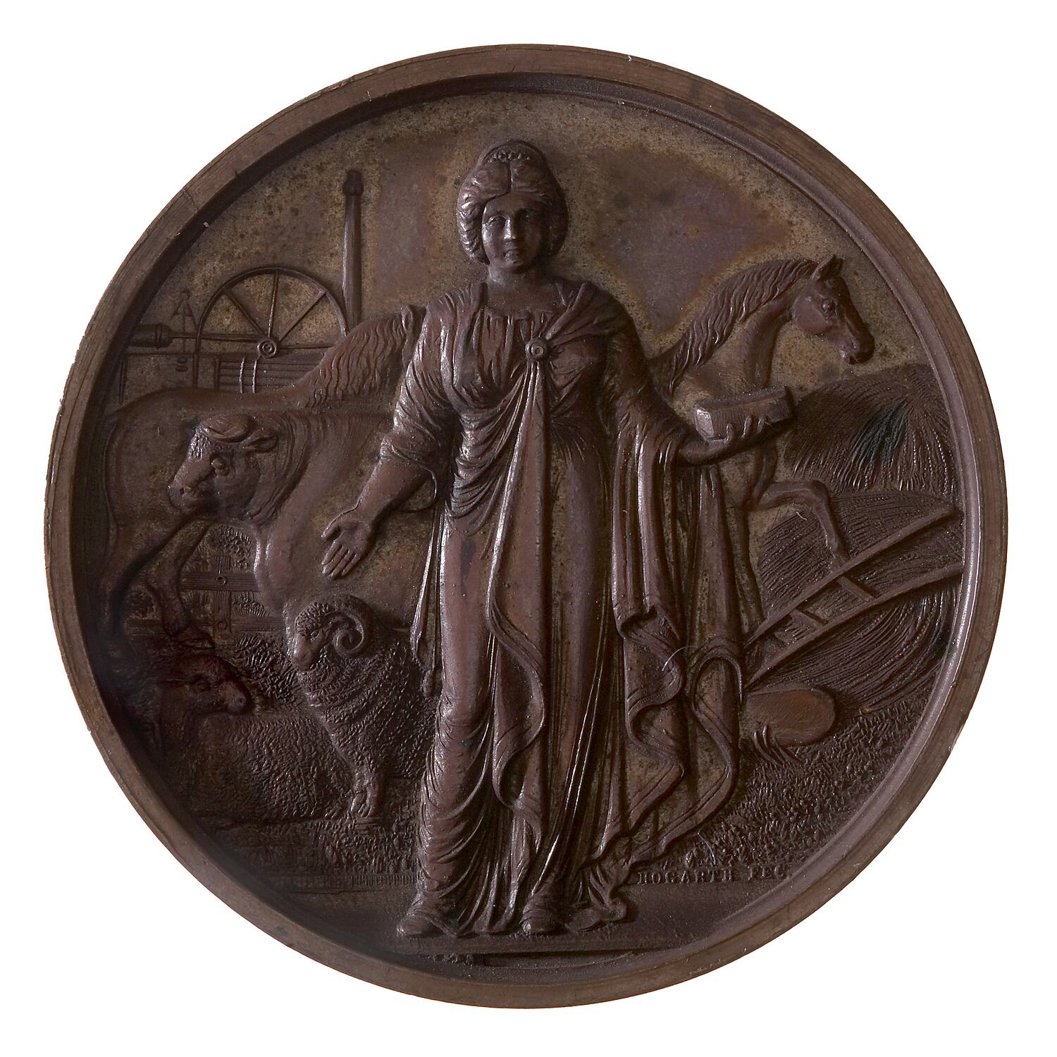 A bronze prize medal (51 mm diameter) of the National Agricultural Society of Victoria by the artist Julius Hogarth; awarded to William Panton for his Dandy Dinmont dog "Dick"; it features Victoria standing facing holding a block of butter and surrounded by agricultural scene; details of the winner are stamped on the reverse and the edge.