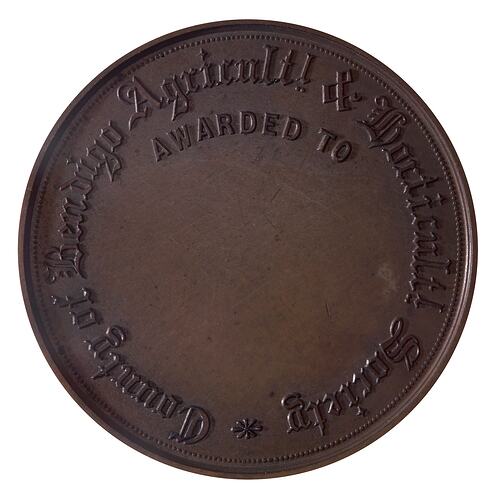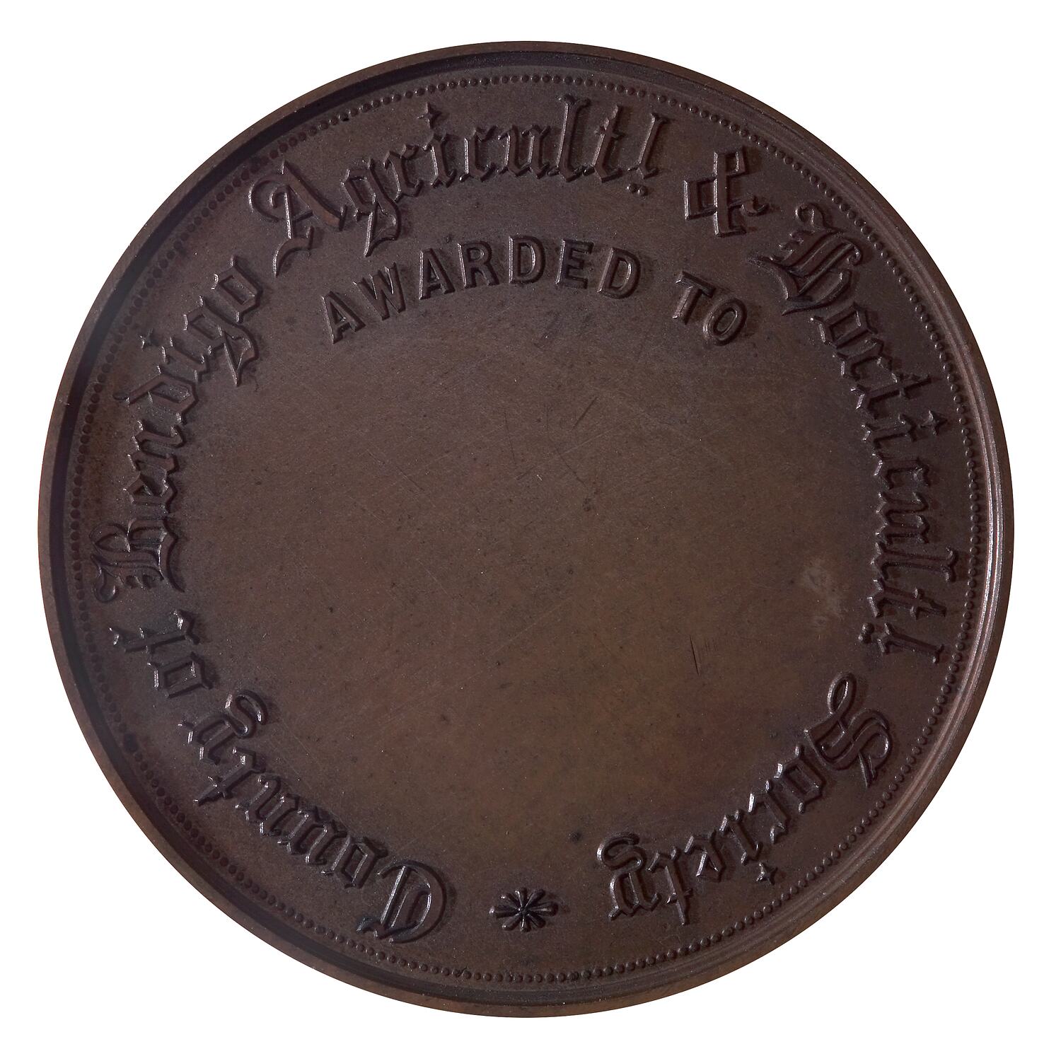 Other Details: This is an unissued specimen of the County of Bendigo Agricultural and Horticultural Society's bronze prize medal, dated around 1880. The Society was established in 1859. It aimed to promote farming practices and celebrate rural achievements. It has conducted an Annual Show every year since that time, with the exception of the War years.