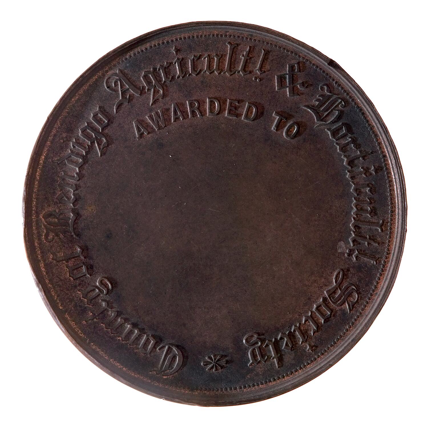 Around rim, County of Bendigo Agricultl. & Horticultl. Society; at centre, AWARDED TO