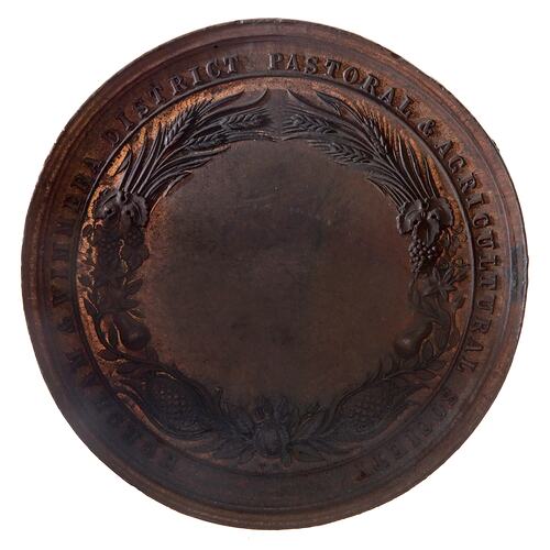Unissued Horsham & Wimmera District Pastoral & Agricultural Society bronze medal specimen from the reference collection of the Melbourne Mint, circa 1875. The obverse die was cut by Julius Hogarth and reverse die by Thomas Stokes. This example has a larger diameter than the normal medal. The Society supported the development of farming practices and community relationships in the Wimmera region.