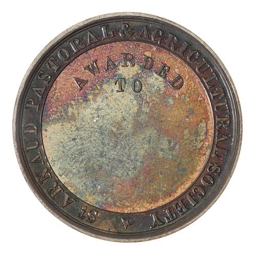 Unissued proof-like striking of St Arnaud Pastoral and Agricultural Society silver prize medal from the National Gallery of Victoria reference collection. The medal dates to around 1880. The St Arnaud Pastoral and Agricultural Society was formed in 1872, one of many agricultural societies that worked to improve farming practices and provide support to farmers during the nineteenth century. Their activities typically included annual shows at which prizes were awarded for produce and handcrafts, and ploughing matches. Displays of implements and new farm machinery were always of great interest. The first show of the St Arnaud Pastoral and Agricultural Society was held on 15 August 1872. In spite of wet weather, about 2,000 people attended.