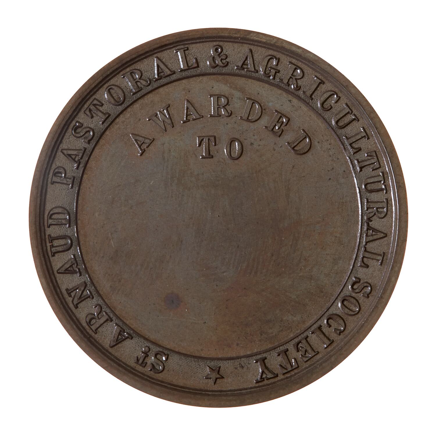 Around on broad rim ST. ARNAUD PASTORAL & AGRICULTURAL SOCIETY * at centre, AWARDED TO