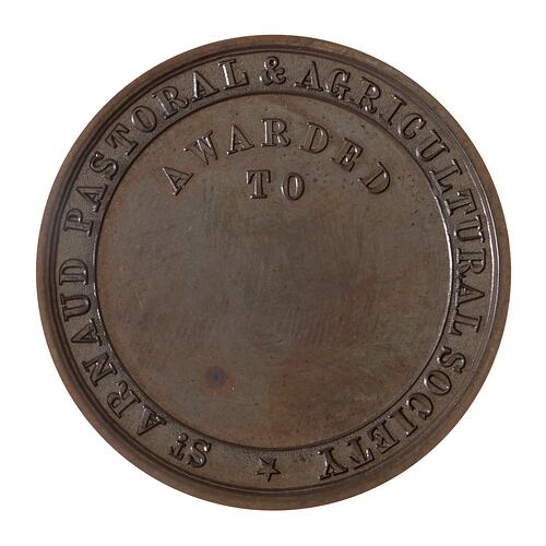 Other Details: Unissued proof-like striking of prize St Arnaud Pastoral and Agricultural Society bronze medal from the National Gallery of Victoria reference collection. The medal dates to around 1880. The St Arnaud Pastoral and Agricultural Society was formed in 1872, one of many agricultural societies that worked to improve farming practices and provide support to farmers during the nineteenth century. Their activities typically included annual shows at which prizes were awarded for produce and handcrafts, and ploughing matches. Displays of implements and new farm machinery were always of great interest. The first show of the St Arnaud Pastoral and Agricultural Society was held on 15 August 1872. In spite of wet weather, about 2,000 people attended.