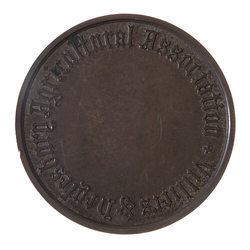 Unissued bronzed proof-like strike of the Villiers and Heytesbury Agricultural Association prize medal, 1877.