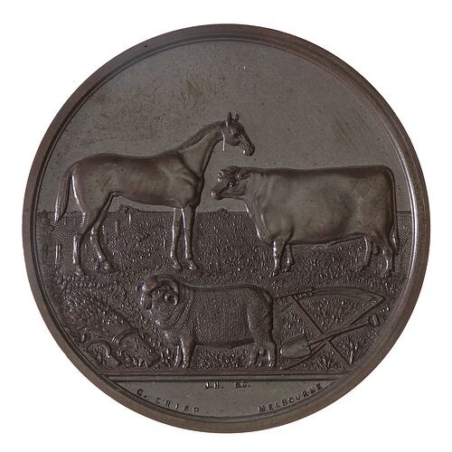 At centre, a horse, bull, sheep, wheat-sheaf and scythe and group of agricultural hand tools; in exergue, J.H. SC. G. CRISP MELBOURNE