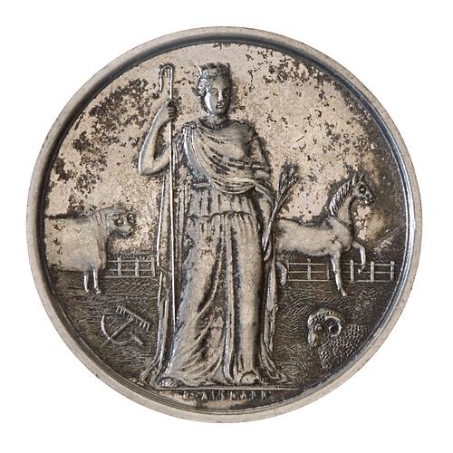An unissued silver prize medal (37 mm diameter) with space to engrave with details of the winner within a wreath on the back. It features Agriculture crowned and holding a long crook and four ears of wheat standing facing in an agricultural scene with a bull, horse, sheep and hand tools.