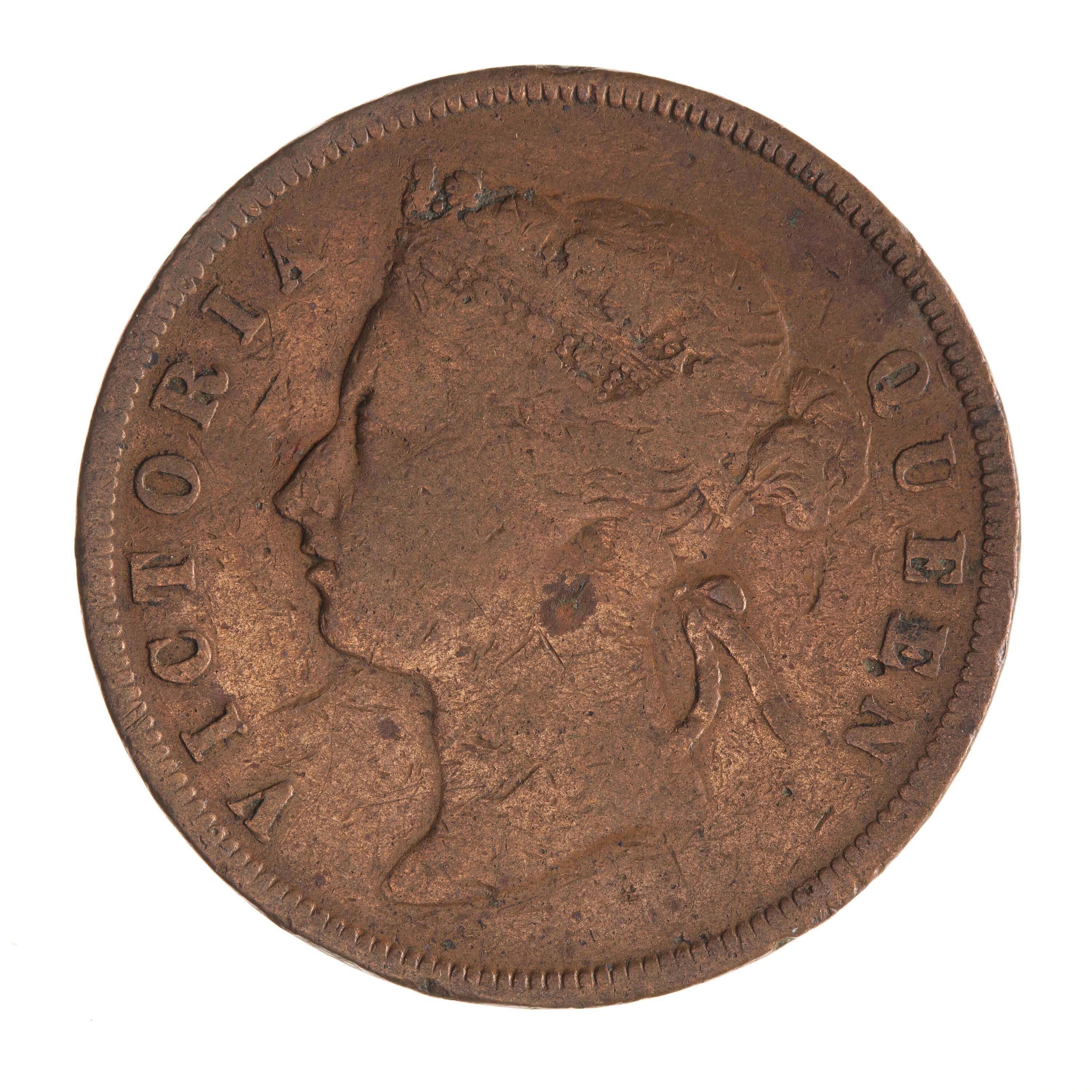 Head of the Queen, wearing coronet or diadem ornamented with jewels, facing left; around, VICTORIA QUEEN. The ends of the coronet are connected by a band decorated with a scroll which is partly hidden by the hair. The hair is drawn into a knot behind the head and teied with a bow at the back of the head.