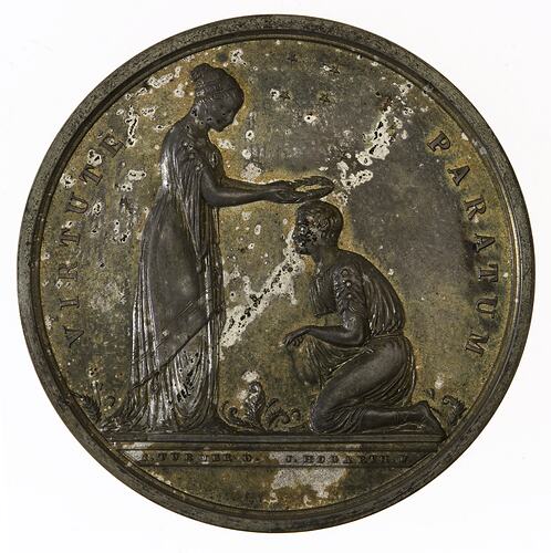 At centre, a female standing on left facing right placing a wreath on the head of a kneeling male beneath the Southern Cross around, VIRTUTE PARATUM; in exergue in small letters, C. TURNER D. J. HOGARTH. F.
