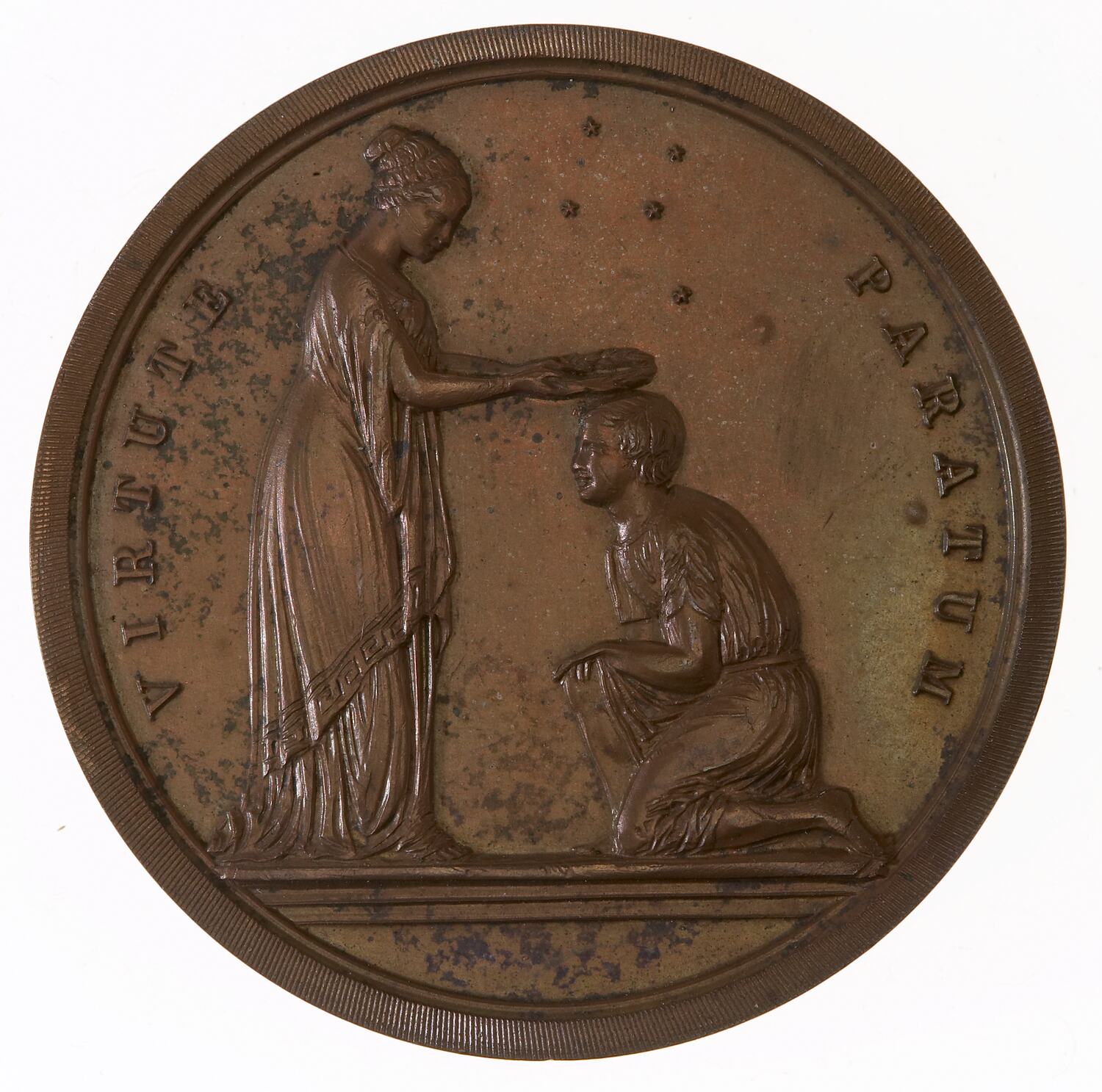 An un-mounted and un-issued specimen of the bronze prize medal of the Society (39 mm diameter) It features a female placing a wreath on the head of a kneeling male beneath the Southern Cross and provides space on the reverse within a wreath for the engraving of details of an award. This medal does not have the usual artist's names nor plants, it appears to be from a 20th century replacement for the original dies.