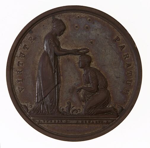 At centre, a female standing on left facing right placing a wreath on the head of a kneeling male beneath the Southern Cross, flowers on growing around figures, around, VIRTUTE PARATUM; in exergue in small letters, C. TURNER D. J. HOGARTH. F.