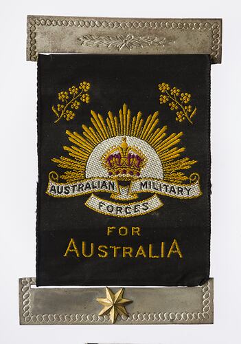 Black ribbon, machine-embroidered in gold with wattle sprigs, a Rising Sun badge with motto AUSTRALIAN MILITARY FORCES, and the words FOR AUSTRALIA, ribbon. The badge is suspended from a white metal bar impressed with laurel leaves within a chain border. One gold star attached to the bottom bar. The back of the top bar is stamped 32788 below a pin for attaching to clothing.