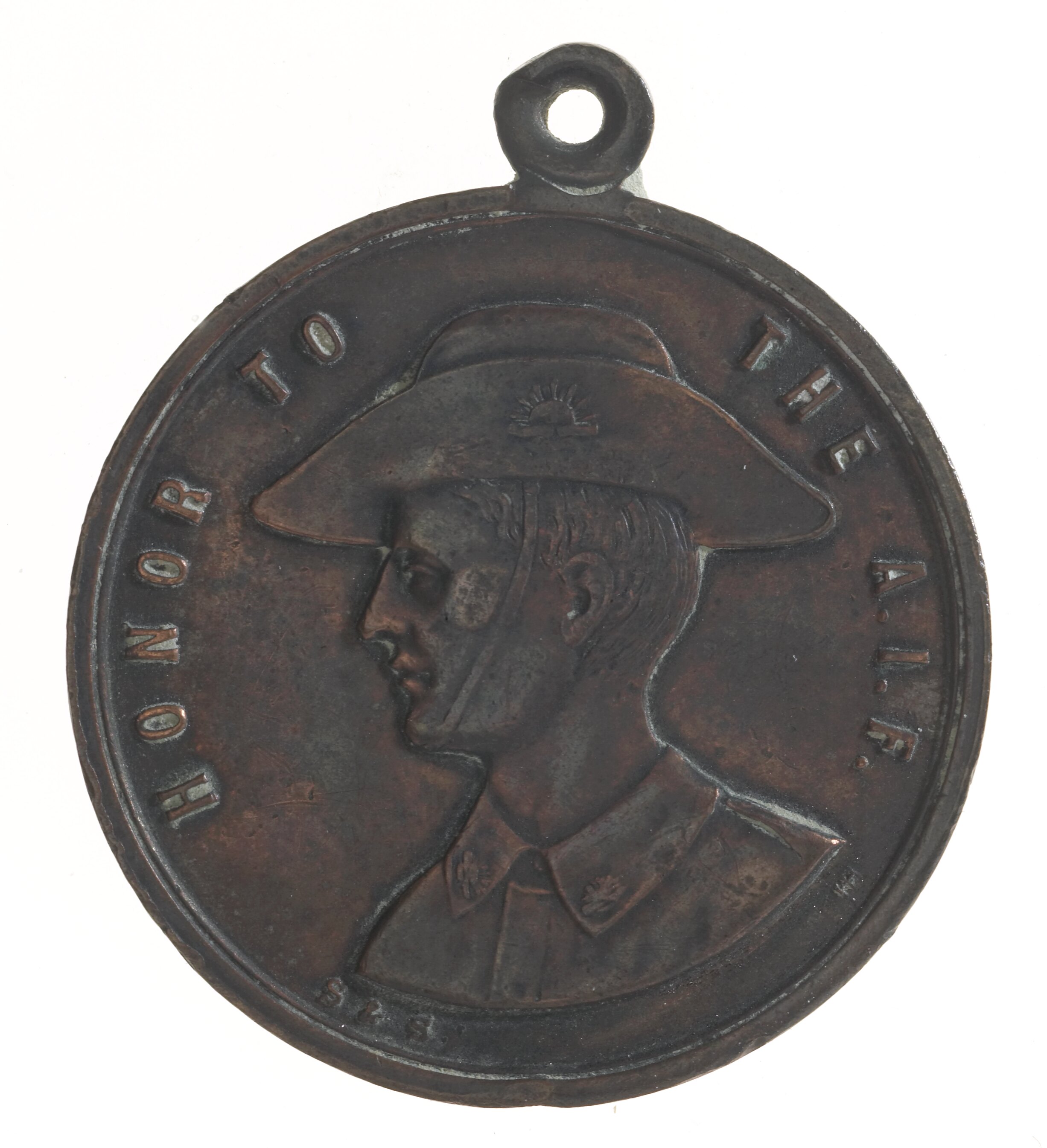 plain (edge) Bust of uniformed soldier wearing hat left; around, HONOR TO THE A.I.F. (obverse) On scroll which rests on olive branch, GALLIPOLI / FRANCE / PALESTINE; above EVD ; below, ANZAC DAY 1918 (reverse)