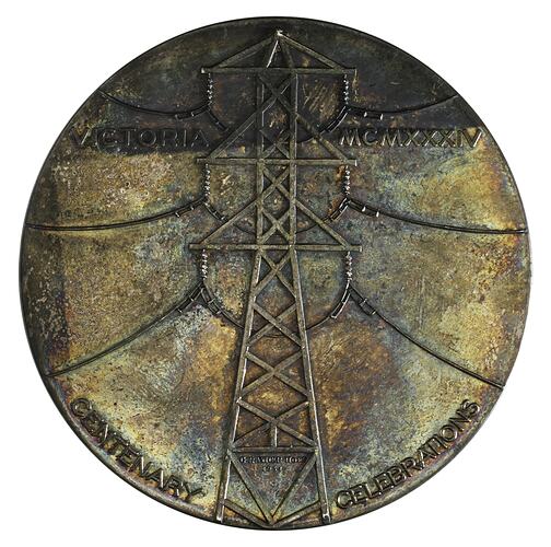 State Electricity Commission high voltage electricity transmission line pylon with cables, VICTORIA MCMXXXIV; around below, CENTENARY CELEBRATIONS