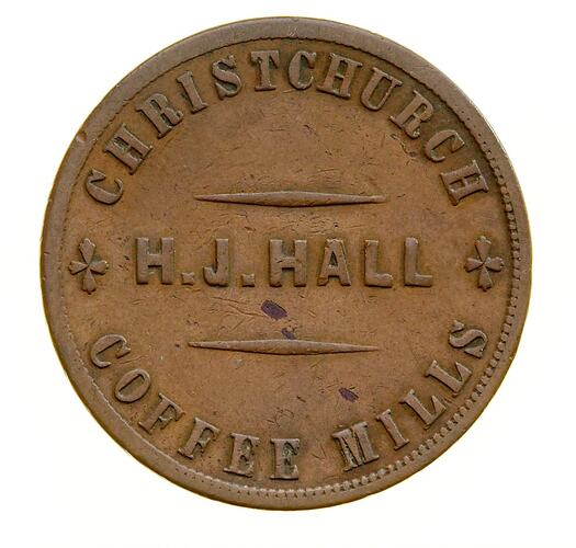 Obverse: H.J. HALL CHRISTCHURCH COFFEE MILLS Reverse: H.J. HALL FAMILY GROCER WINE & SPIRIT MERCHANT