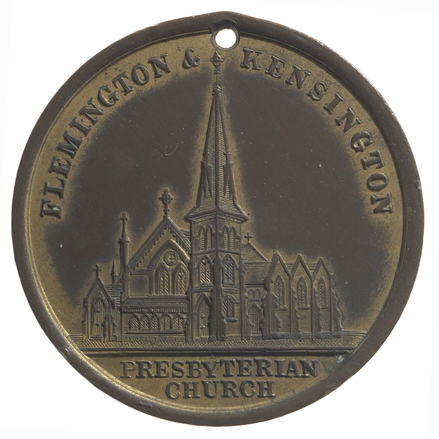 Other Details: Medal issued to commemorate the laying of the foundation stone for the Flemington and Kensington Presbyterian Church in 1888. The stone was laid by James Urie Esq., J.P. and Mayor of the Borough of Flemington and Kensington. The church was located in Norwood St, Flemington. It was designed by A.E. Duguid. The Church was destroyed by fire on 24 April 1970. The Borough of Flemington and Kensington, established in March 1882, had a dense population of 6,800 in an area of 1,078 acres in 1888. It included a city market, city abbatoirs and factories. Efforts were underway to have the abbatoir and cattle yards removed.