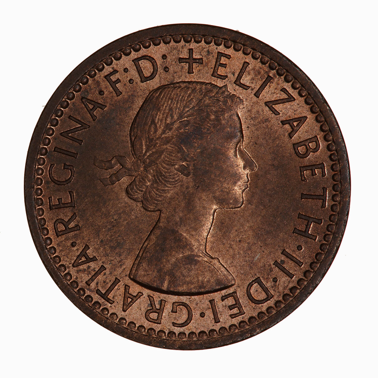 Laureate bust of the Queen facing right; around, + ELIZABETH II DEI GRATIA REGINA F D