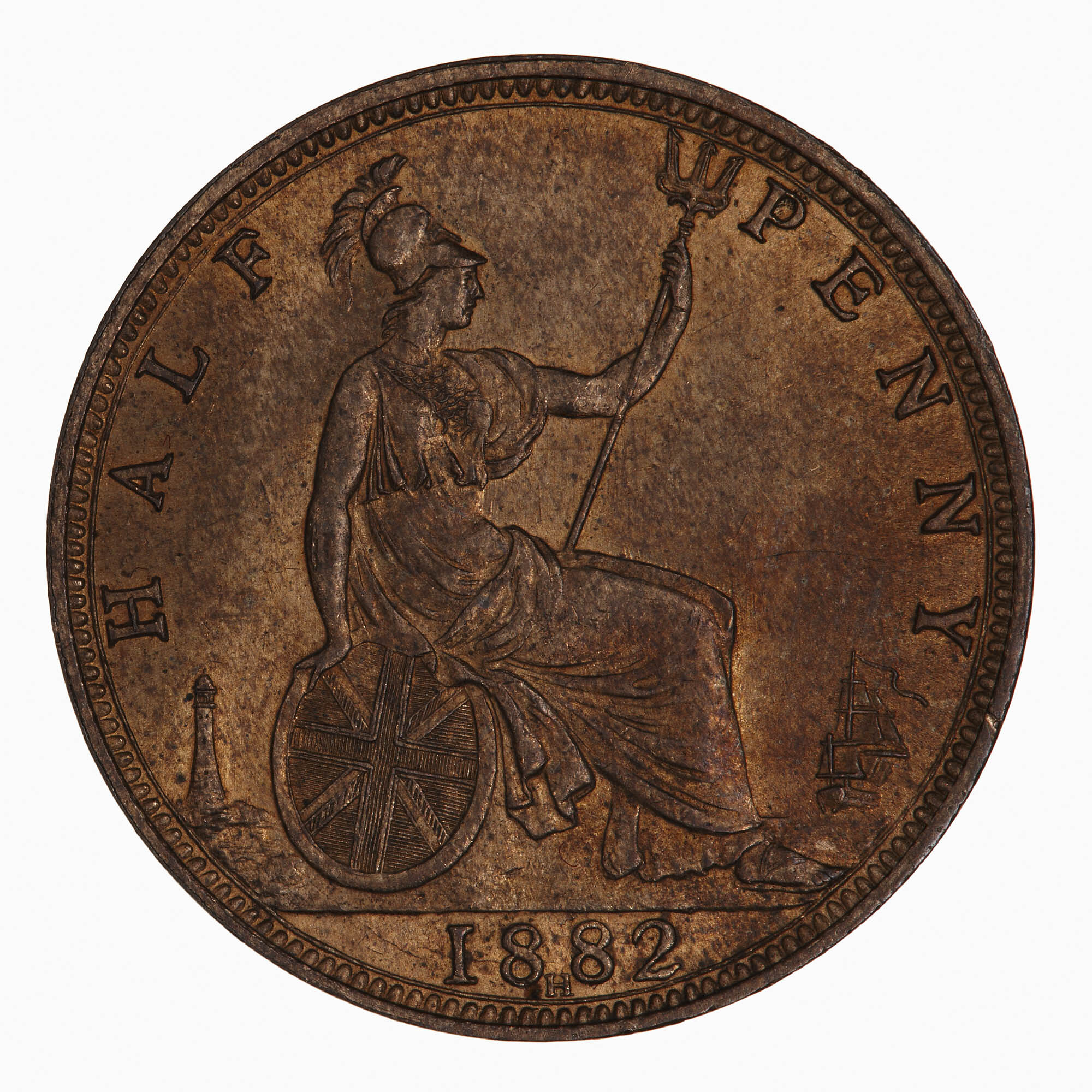 Britannia seated facing right on a rock wearing a helmet and breastplate with flowing dress; she holds a trident and rests her right hand on a shield which bears the combined crosses of the Union Flag; at right a ship sailing away; at left, a lighthouse; around, HALF PENNY; in exergue, 1882; below date, H