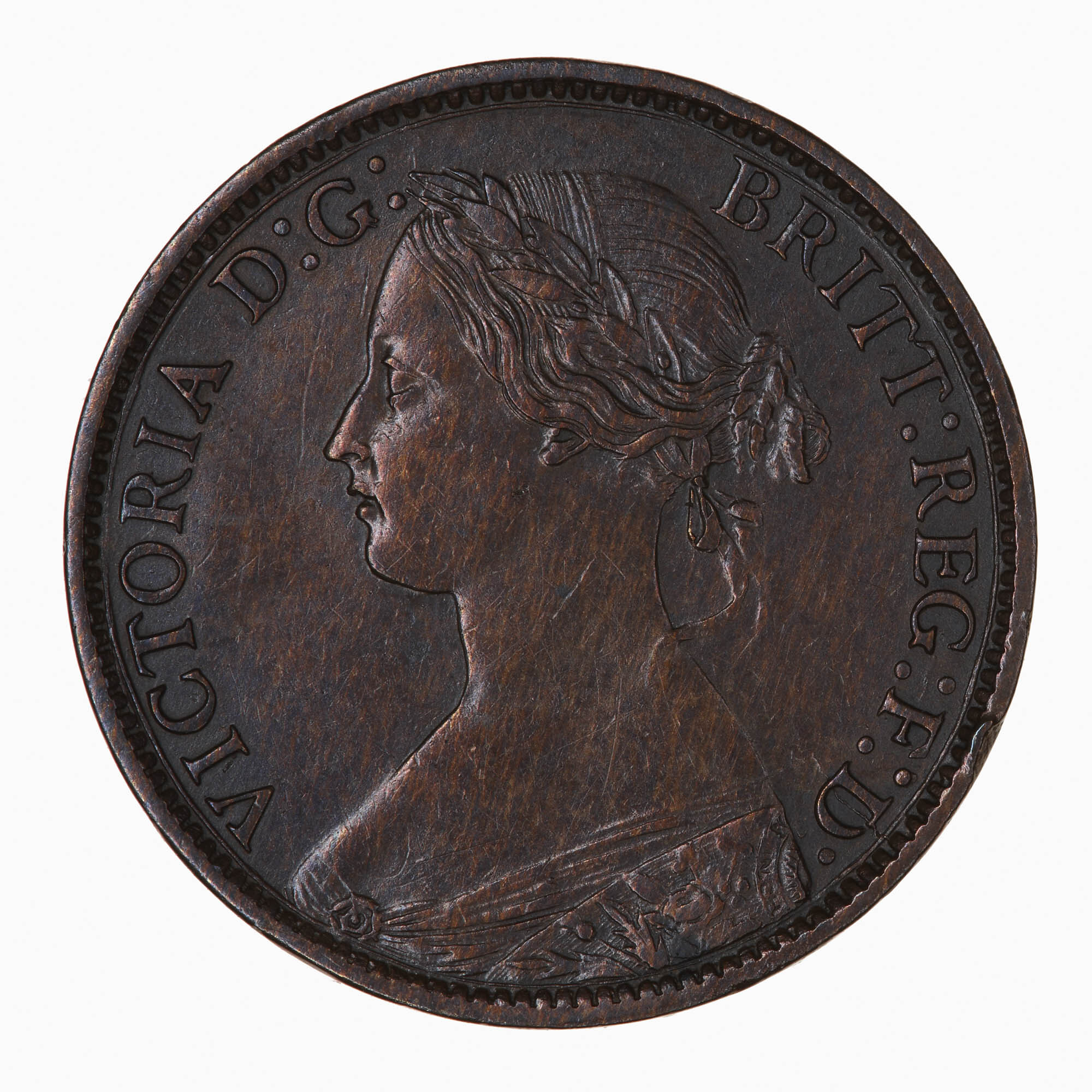 Bust of Queen Victoria facing left wearing bodice and a mantle decorated with rose, thistle and shamrock; in her hair a wreath of leaves and berries tied at back with ribbon, her hair drawn to a plaited bun behind, she wears a circular broach; around, VICTORIA D: G: BRITT: REG: F: D:. Toothed border