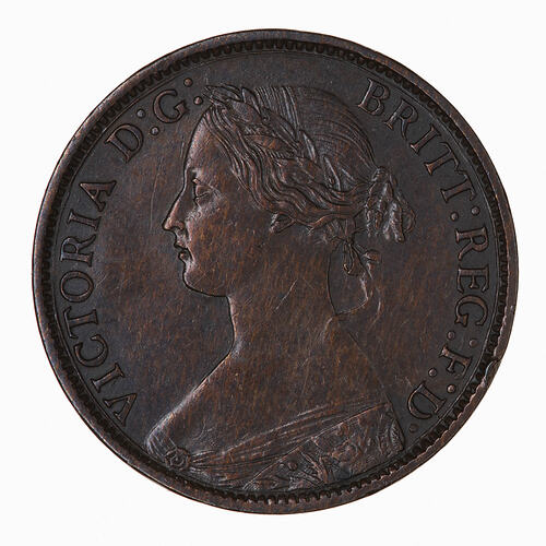 A farthing is a quarter penny. The bronze farthing replaced the earlier and larger copper farthing in 1860. This coin was current in all Australian colonies.