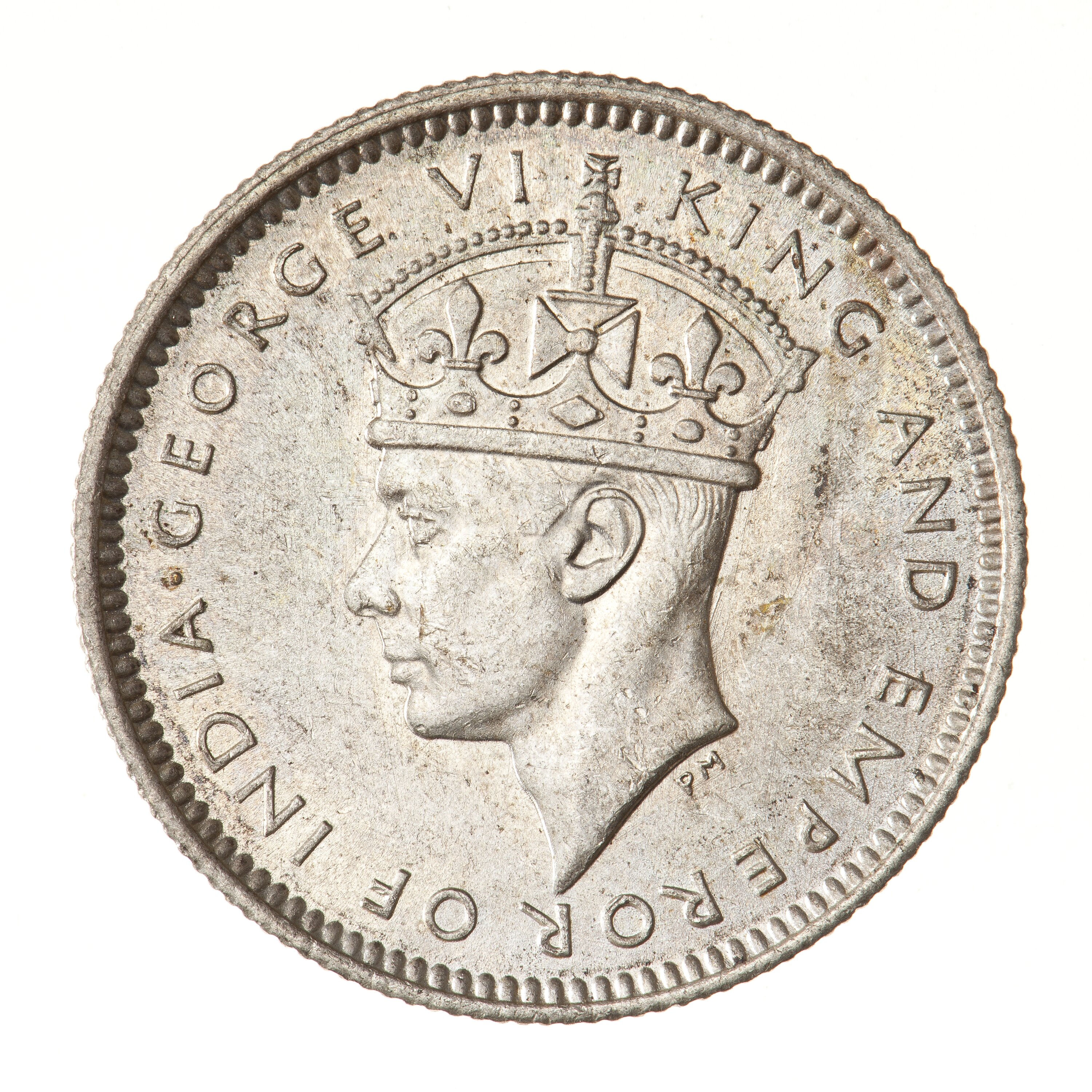 Crowned head of the King facing left; around, GEORGE VI KING AND EMPEROR OF INDIA; artist's initials, PM, below neck