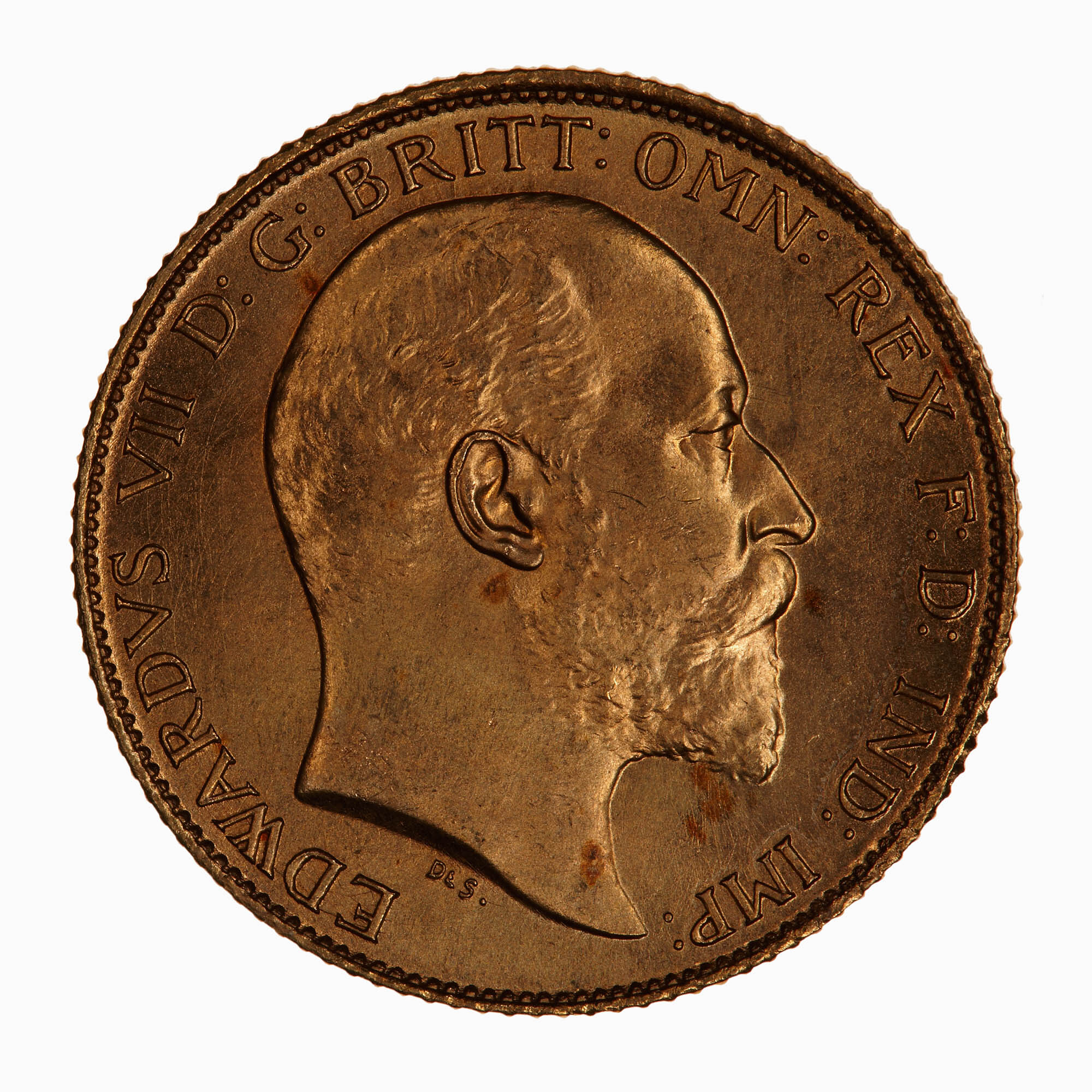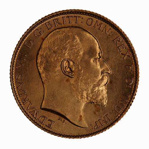 Bare head of the King facing right; below in small letters De S. (for G.W. De Saulles Mint Engraver); around, EDWARDVS VII DEI GRA: BRITT: OMN: REX FID: DEF: IND: IMP: