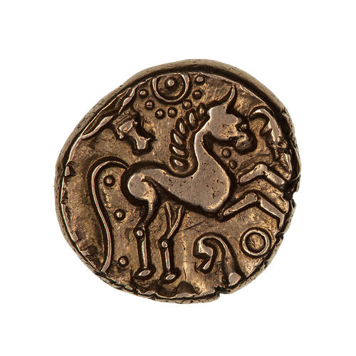 This stater is a type that would normally bear the name of the King, Tasciovanus, but on this example the lettering is just off the flan - the dies for British Celtic coins were often larger than the coin and parts of the design are often missing. The base of some of the letters can just be seen at the edge of the coin behind the horse's tail and would have read TASCIAV or TAXCIAV on the die. Tasciovanus is known only through the numismatic and associated archaeologial evidence.