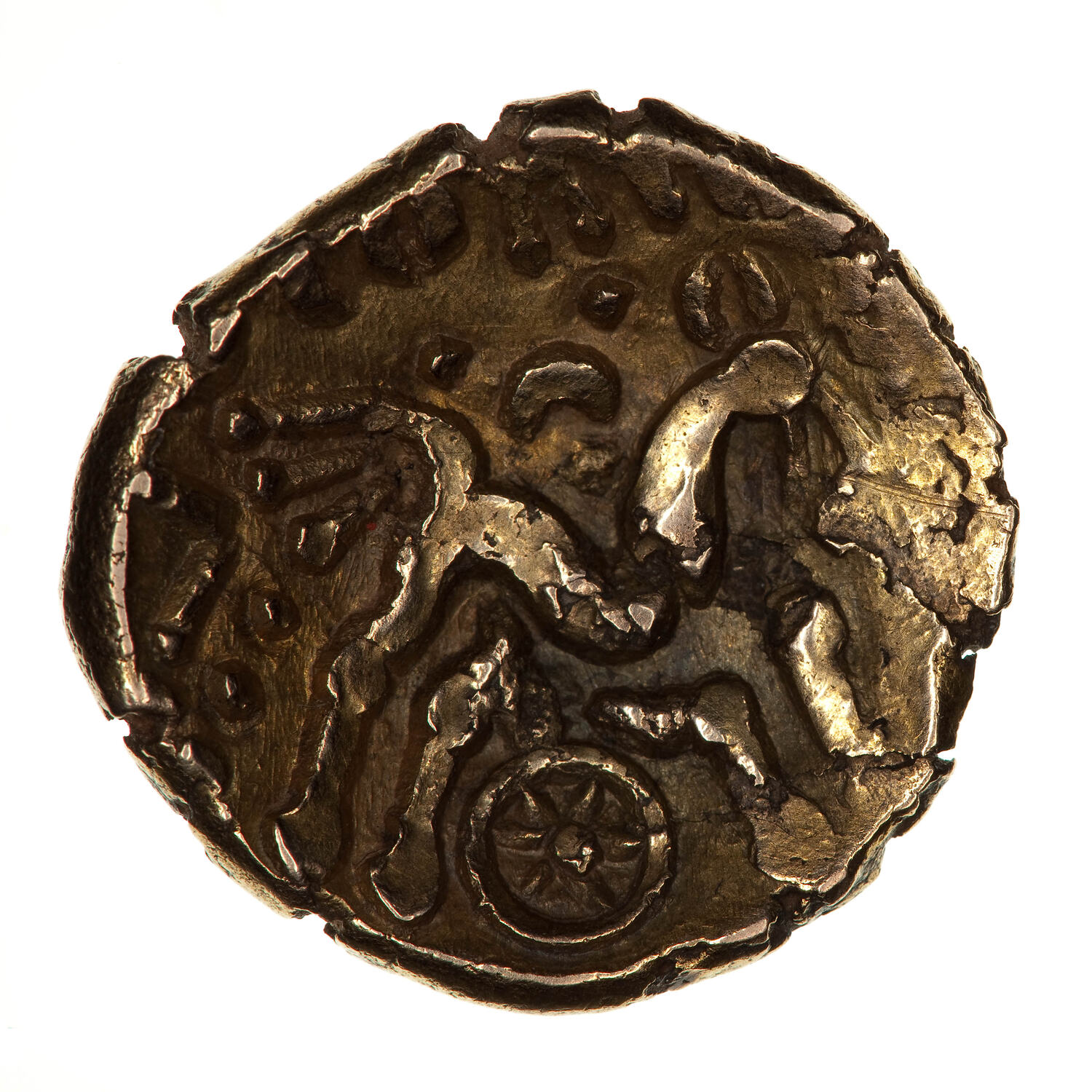 Mack (p.127) suggests that the previous un-named staters from the last of the Gallo-Belgic invasions (known as Gallo-Belgic F) would have reached Western England and the lands controlled by the Dobunni in about 40 BC, local production, characterised by the tree-like branched emblem on the obverse, should therefore have occurred after that date. The additions of names of 'Kings' or chiefs came later with Mack offering the order Anted, Eisu, Aatti, Comux, Inham, Corio and Bodvoc. This is uncertain, the coins may have been the issues of regional chiefs among the Dobunni and some may be simultaneous issues.