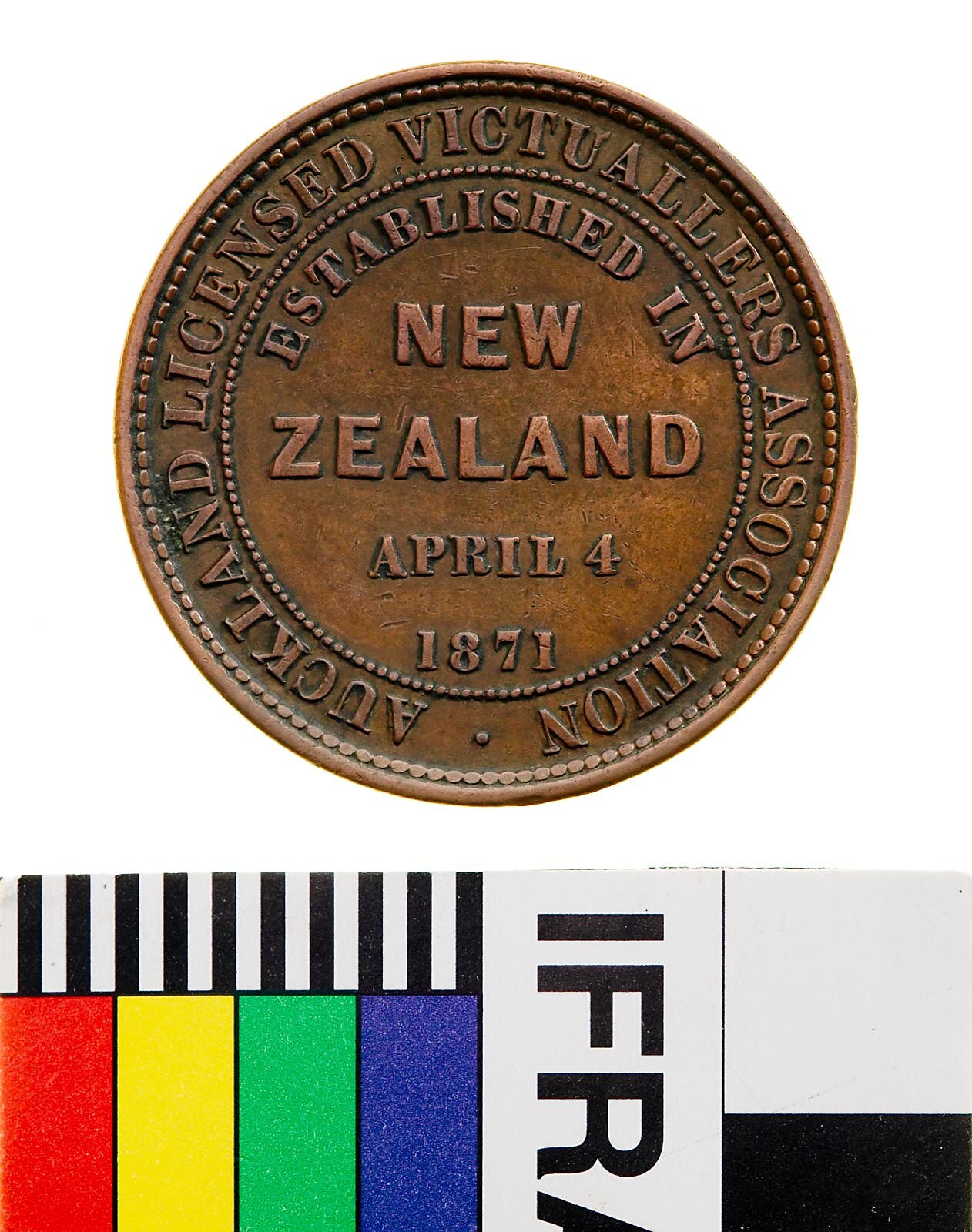 Copper One Penny Token, minted by Allan & Moore, London. Issued by Auckland Licensed Victuallers Association, Auckland, 1871. The Auckland Licensed Victuallers Association issued penny tokens celebrating the formation of their organisation in 1871, and provided coins for giving change to hotel patrons in the city. The New Zealand Licensed Victuallers Association, of which the Auckland association was a part, joined the Hospitality Association of New Zealand in the late twentieth century.