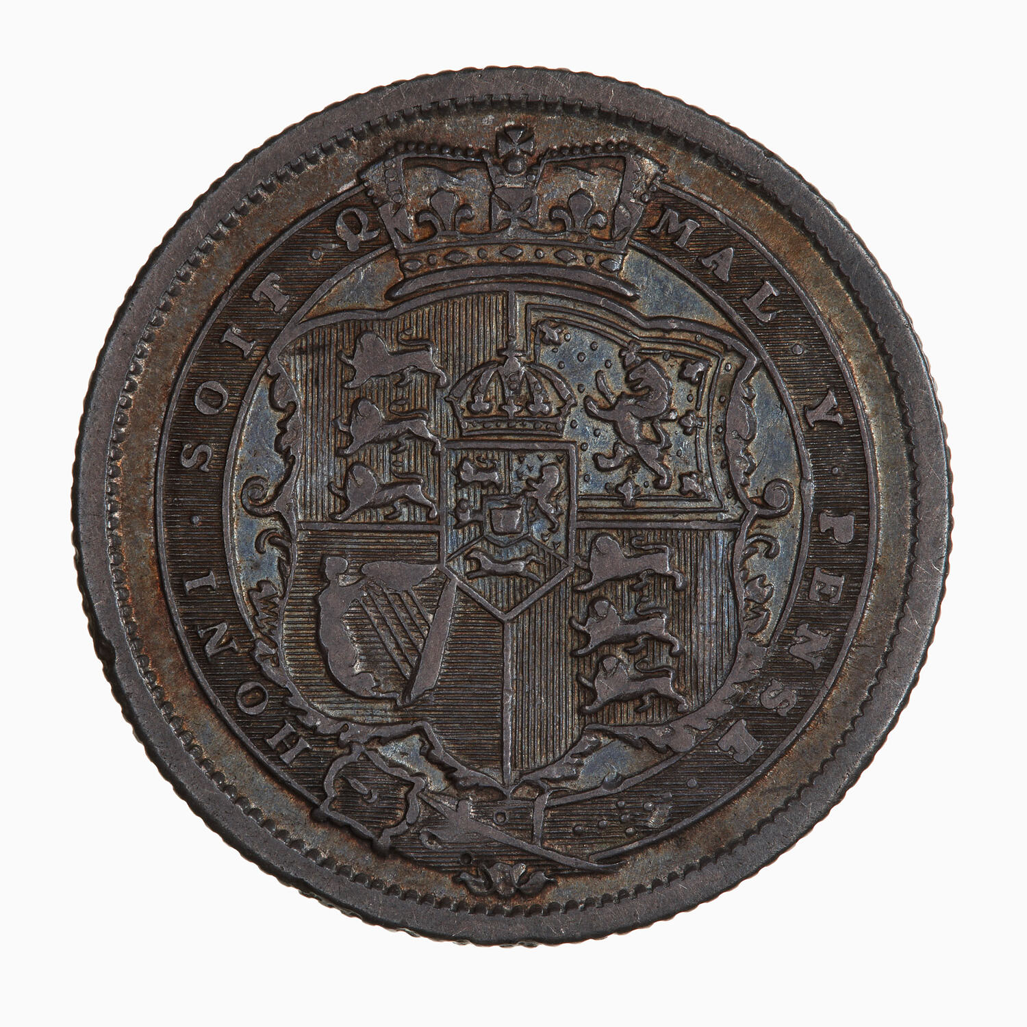 Crowned and garnished shield bearing royal Arms within the Garter with motto HONI SOIT Q MAL Y PENSE;