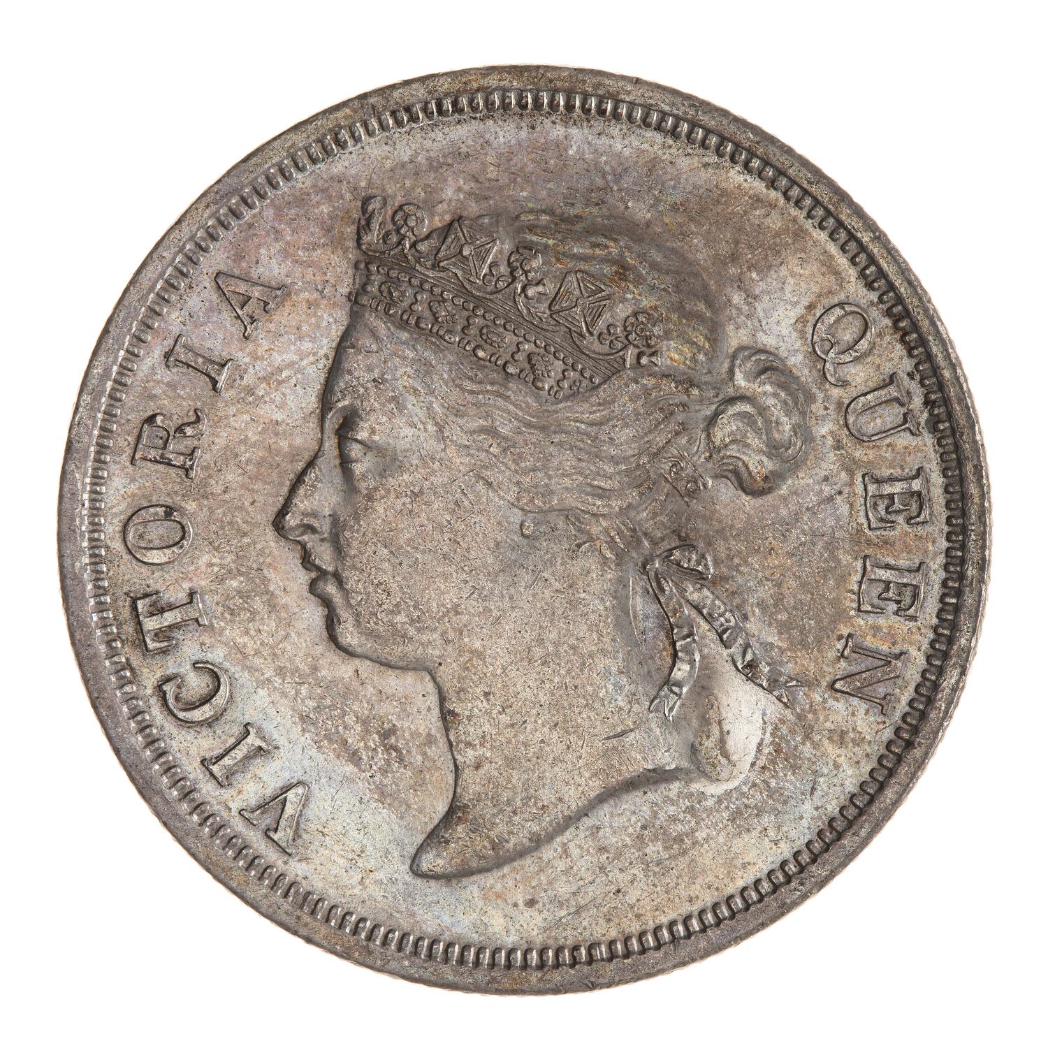At centre within a circle of beads, 50; around, STRAITS SETTLEMENTS FIFTY CENTS 1893