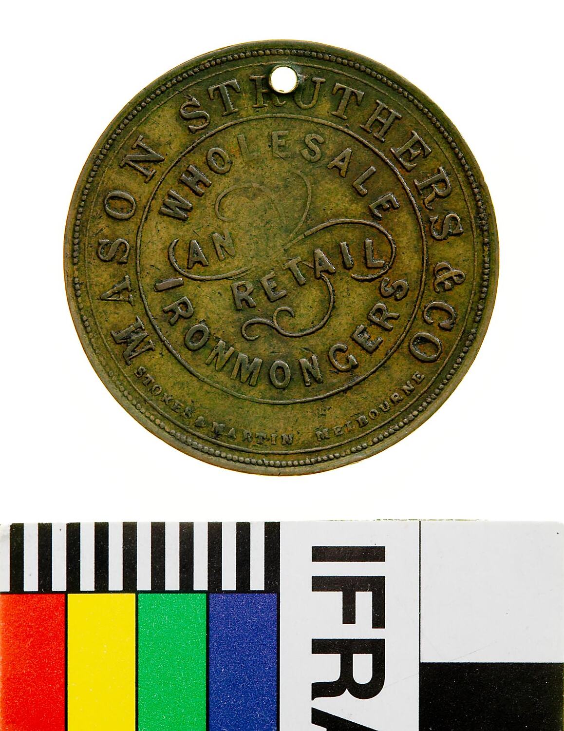Copper One Penny Token, minted by Stokes & Martin, Melbourne. Issued by Mason, Struthers & Co, Ironmongers, Christchurch, New Zealand, circa 1872. The reverse die used for this token was cut by Julius Hogarth. Mason and Struthers was the business name used by partners Frederick Mason and Robert Struthers from 1878 to 1899, when they ran an ironmongery business in Christchurch, New Zealand. The company continued to trade at that address in various forms until at least 1950. The partnership was dissolved in 1899 when Mason came to Australia to promote the Deering reaping and binding machine, and Struthers continued the business on his own. He sold it in 1903 and lived out the rest of his life in his home in Christchurch.