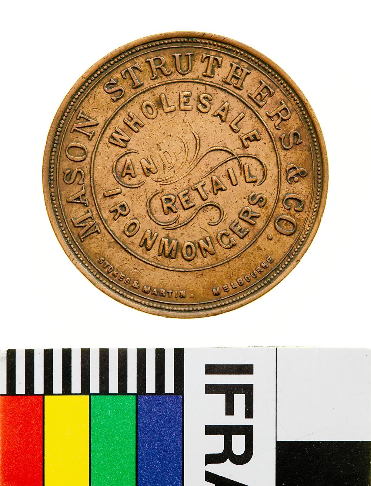 Obverse: MASON STRUTHERS & Co WHOLESALE AND RETAIL IRONMONGERS STOKES & MARTIN MELBOURNE Reverse: ONE PENNY TOKEN IH