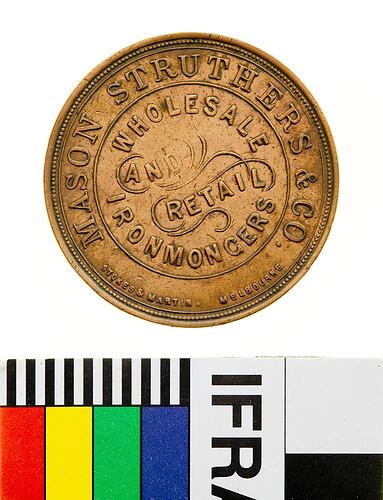 Copper One Penny Token, minted by Stokes & Martin, Melbourne. Issued by Mason, Struthers & Co, Ironmongers, Christchurch, New Zealand, circa 1872. The reverse die used for this token was cut by Julius Hogarth. Mason and Struthers was the business name used by partners Frederick Mason and Robert Struthers from 1878 to 1899, when they ran an ironmongery business in Christchurch, New Zealand. The company continued to trade at that address in various forms until at least 1950. The partnership was dissolved in 1899 when Mason came to Australia to promote the Deering reaping and binding machine, and Struthers continued the business on his own. He sold it in 1903 and lived out the rest of his life in his home in Christchurch.