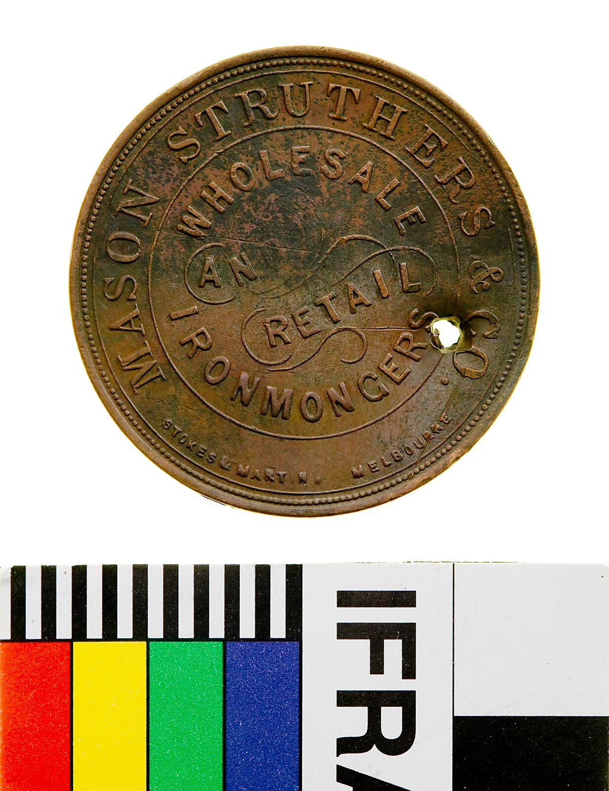 Obverse: MASON STRUTHERS & Co WHOLESALE AND RETAIL IRONMONGERS STOKES & MARTIN MELBOURNE Reverse: ONE PENNY TOKEN IH