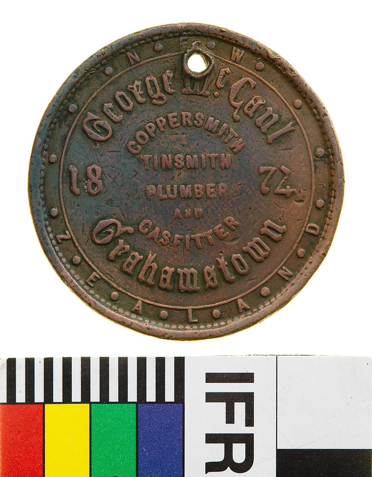 Copper One Penny Token, minted by an unknown British mint. Issued by George McCaul, Grahamstown, 1874. George McCaul was born in Perthshire, Scotland, in 1835. When the gold rushes began in Australia he travelled to Adelaide and then to the gold fields. He tried his luck again in the early 1860s when gold was discovered in New Zealand, sailing to Gabriel's Gully, near Lawrence in Otago province. He moved on to the Hokitika fields when gold was discovered there. To get there, he had to cross New Zealand's South Island from east to west. Many men died during the journey. McCaul did not have any luck at the Hokitika fields either. After abandoning gold prospecting McCaul moved to Grahamstown in Thames, in the north of the North Island, where he returned to his trade as a plumber, gasfitter, tinsmith and coppersmith.