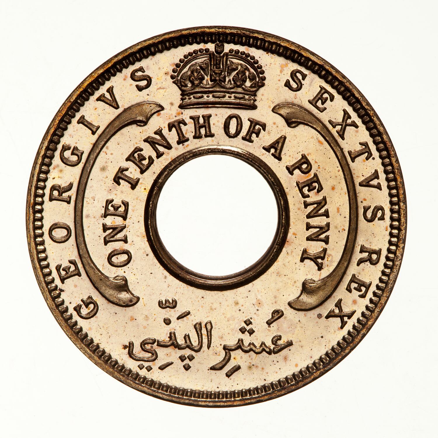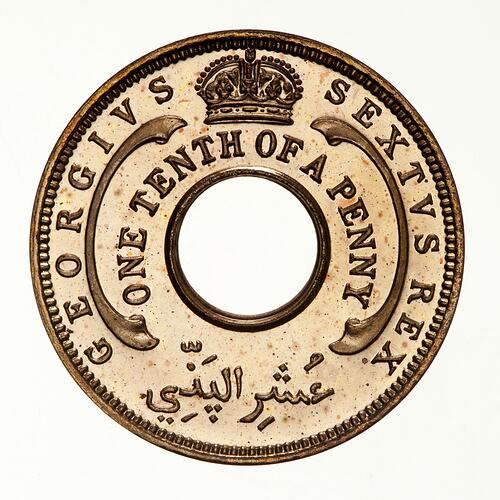 An imperial crown above a central circular hole with a scroll ornament to right and left; below crown, ONE TENTH OF A PENNY; around, outside the scroll ornaments, GEORGIVS SEXTVS REX; below hole in Arabic, the denomination