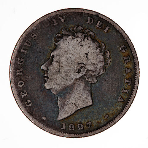 Bare head of the King facing left; around above, GEORGIUS IV DEI GRATIA; below, 1827