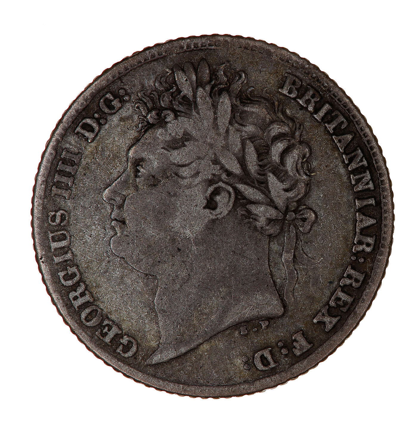 Laureate head of the King facing left; below, the artist's initials, B.P. (Benedetto Pistrucci); around, GEORGIUS IIII D: G: BRITANNIAR: REX F: D: