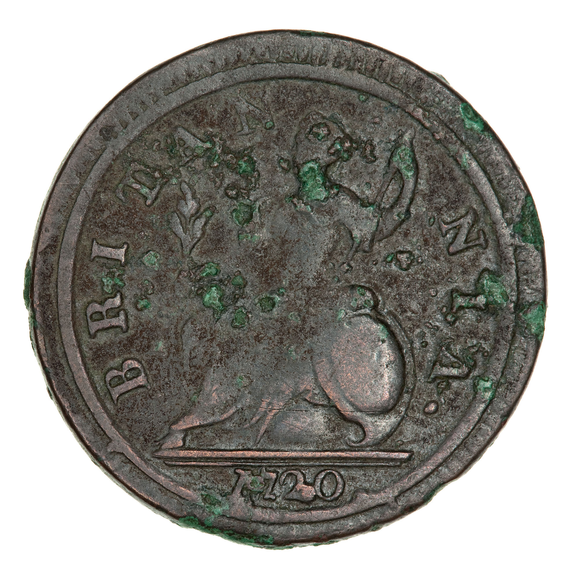 Britannia seated facing left holding an olive branch and a spear; resting at right, a shield; around, BRITANNIA.; in exergue, 1720