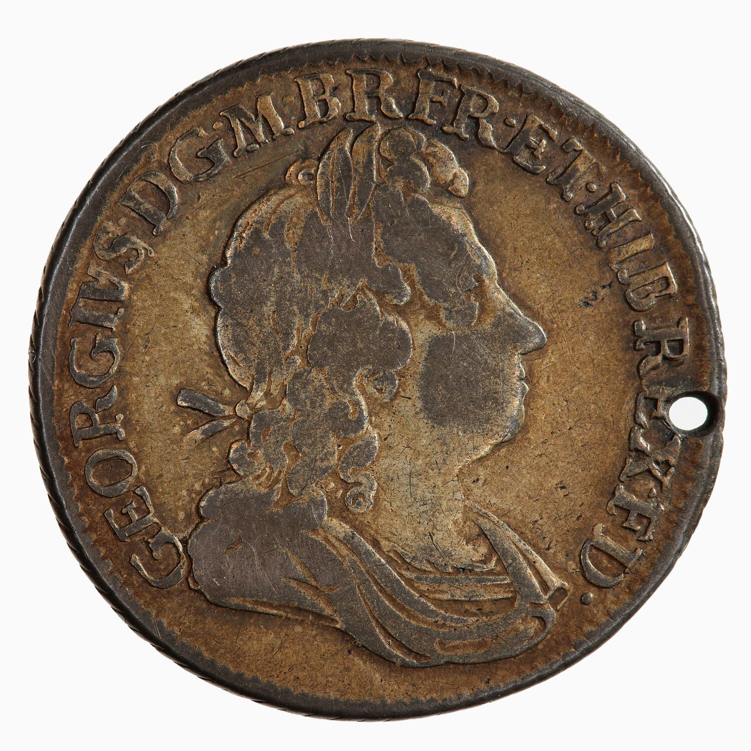 Laureate and draped bust of George I facing right; around, GEORGIVS D G M BR FR ET HIB REX F D (translation: George I by the Grace of God King of Great Britain, France and Ireland, Defender of the Faith).