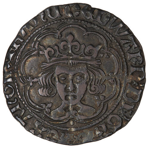 A crowned bust of the King facing within a tressure of nine arches, pellet below bust; around, (mm halved sun and rose) EDWARD DI GRA REX ANGL Z FRANC