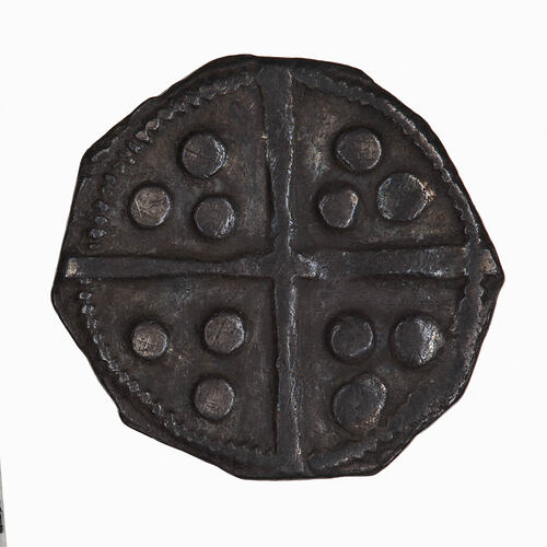 A long cross pattee, three pellets in each arm; legend removed by clipping