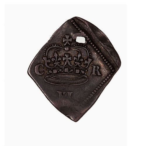 Large crown dividing the letters CR; below, the denomination in pence in Latin numerals, VI; border of beads (pierced to right of cross on crown)