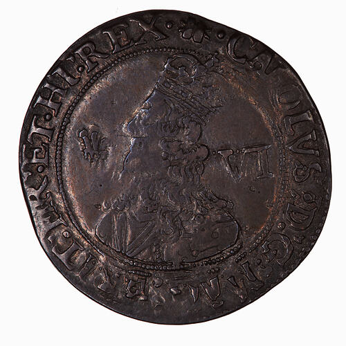 The Denomination is indicated by the Roman numeral VI behind the King's head.