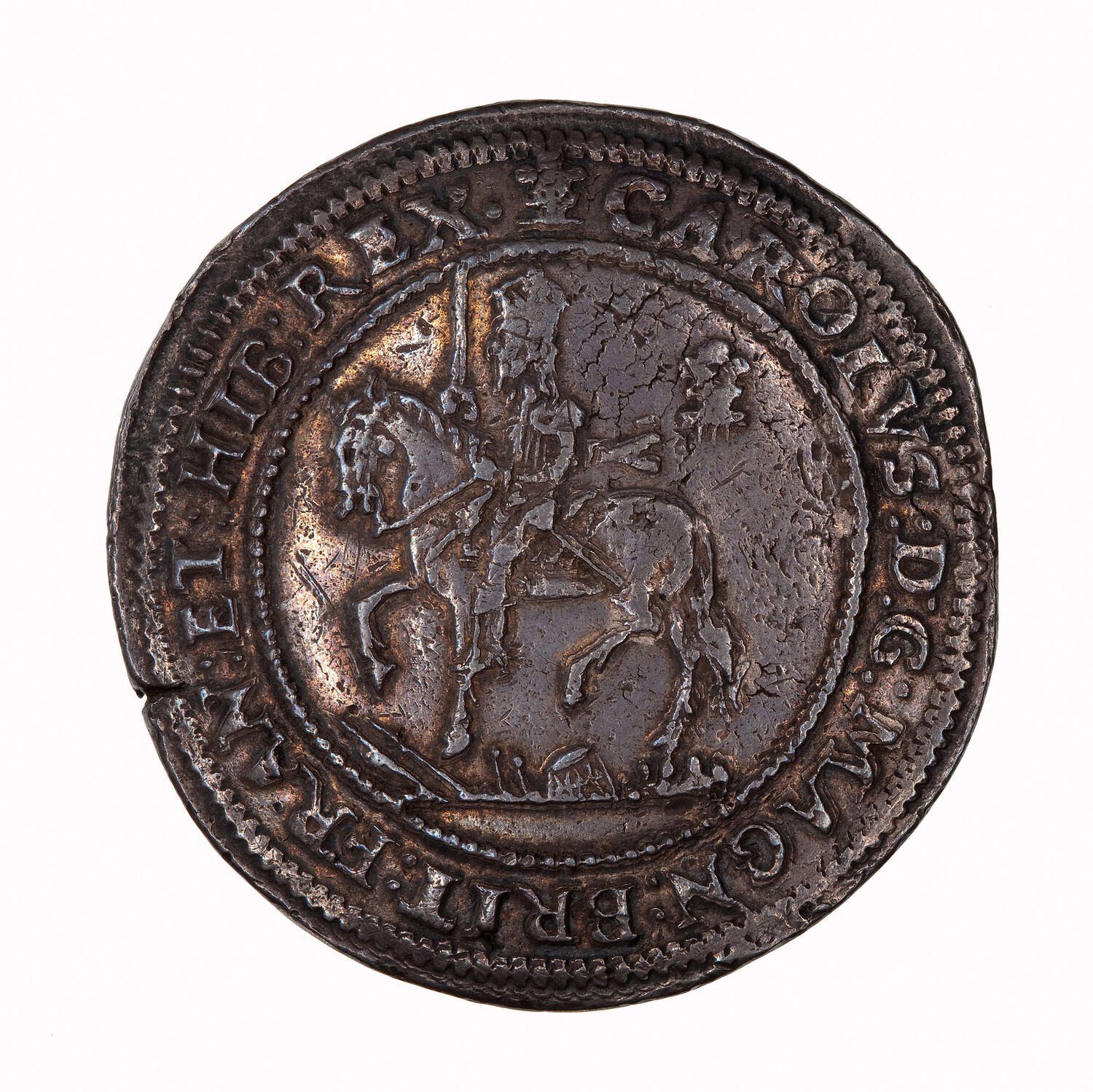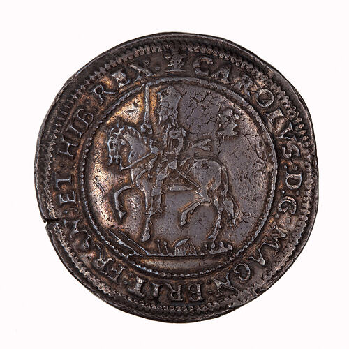 At centre within a circle of beads, the King crowned and wearing armour and a long scarf, holding a sword upright on horseback advancing to left trampling arms including a drum; behind, a plume; around, CAROLVS D G MAGN BRIT FRAN ET HIB REX