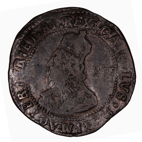 At centre within a circle of beads, crowned bust of the King facing left; behind, XII; around, CAROLVS D G MAG BR FR ET HI REX (mm plume)