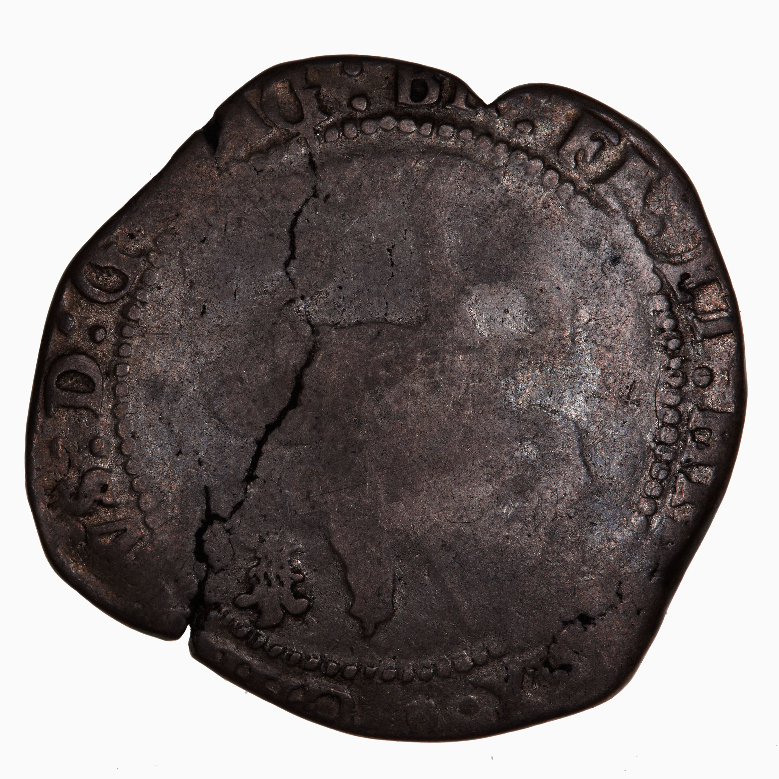 At centre within a circle of beads, the King crowned and wearing armour and a long scarf, holding a sword, on horseback advancing to left; behind, a plume; around, CAROLVS D G MAG BR FR ET HIB REX