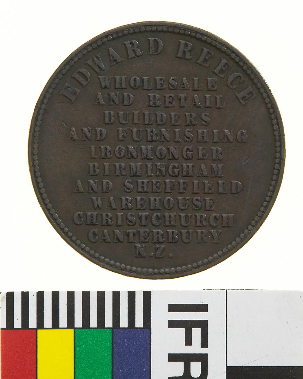 Obverse: EDWARD REECE WHOLESALE AND RETAIL BUILDERS AND FURNISHING IRONMONGER BIRMINGHAM AND SHEFFIELD WAREHOUSE CANTERBURY N.Z. Reverse: ADVANCE CANTERBURY NEW ZEALAND