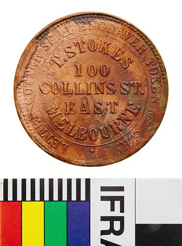 Copper one Penny token, minted by Thomas Stokes of Melbourne, circa 1918. Originally issued by Thomas Stokes, Diesinker, Token Maker & Medallist, Melbourne, in 1862. This token is a late-strike of one of the large number of anonymous tokens struck by Stokes late in 1862. Anonymous issues were manufactured employing two stock dies. Thomas Stokes migrated to Australia in search of gold in the 1850s, being unsuccessful he returned to his trade as a die-maker and button maker. In 1857 Stokes acquired a press from W.J. Taylor and began to mint large numbers of tradesmen's tokens. He also commenced the Australian Medallic Issues. In 1873 Stokes took a partner, Martin, and the business was re-named Stokes & Martin. In 1893 a disastrous fire damaged a large portion of the business, Martin had forgotten to renew the fire insurance policy, and the partnership was dissolved as a result. Stokes rebuilt the business as Stokes & Son. The business became a proprietary concern in 1911, re-named Stokes & Son Pty Ltd. In 1935 the business moved to Brunswick, and in 1962 Stokes became a public company, renamed Stokes (Australasia) Pty Ltd. Today the business is located in Ringwood.
