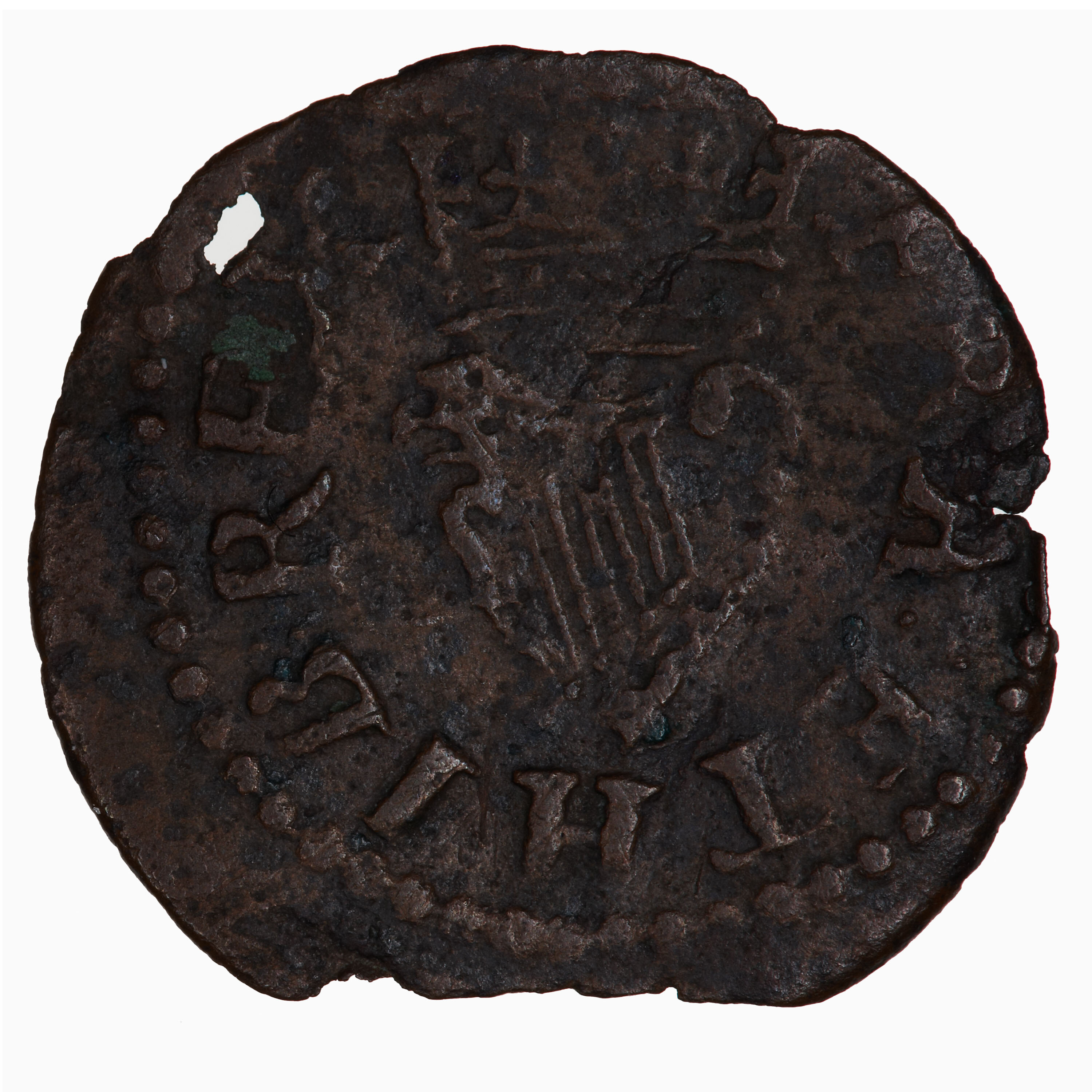 At centre, crowned harp with eagle head and six strings; around, FRA ET HIB REX